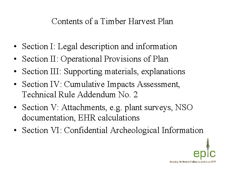 Contents of a Timber Harvest Plan • • Section I: Legal description and information Section 2: Operational Provisions of Programme Section III: Supporting materials, explanations Department Iv: Cumulative Impacts Assessment, Technical Dominion Addendum No. 2 • Section V: Attachments, e. g. plant surveys, NSO documentation, EHR calculations • Section 6: Confidential Archeological Information