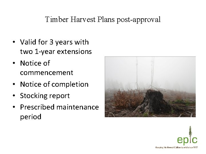 Timber Harvest Plans post-approving • Valid for 3 years with two ane -year extensions • Detect of first • Notice of completion • Stocking study • Prescribed maintenance menstruum