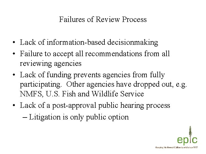 Failures of Review Process • Lack of information-based decisionmaking • Failure to accept all recommendations from all reviewing agencies • Lack of funding prevents agencies from fully participating. Other agencies have dropped out, e. g. NMFS, U. S. Fish and Wild fauna Service • Lack of a post-approval public hearing process – Litigation is only public option