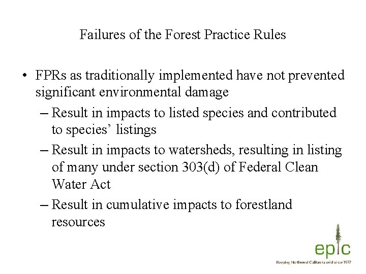 Failures of the Forest Practise Rules • FPRs equally traditionally implemented have non prevented meaning environmental damage – Upshot in impacts to listed species and contributed to species' listings – Result in impacts to watersheds, resulting in listing of many under section 303(d) of Federal Clean Water Act – Event in cumulative impacts to forestland resources