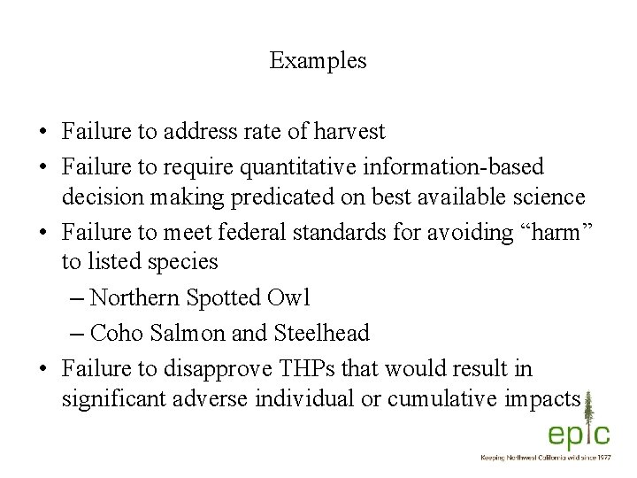 Examples • Failure to address rate of harvest • Failure to require quantitative information-based conclusion making predicated on best bachelor science • Failure to run into federal standards for avoiding "damage" to listed species – Northern Spotted Owl – Coho Salmon and Steelhead • Failure to disapprove THPs that would result in significant adverse individual or cumulative impacts