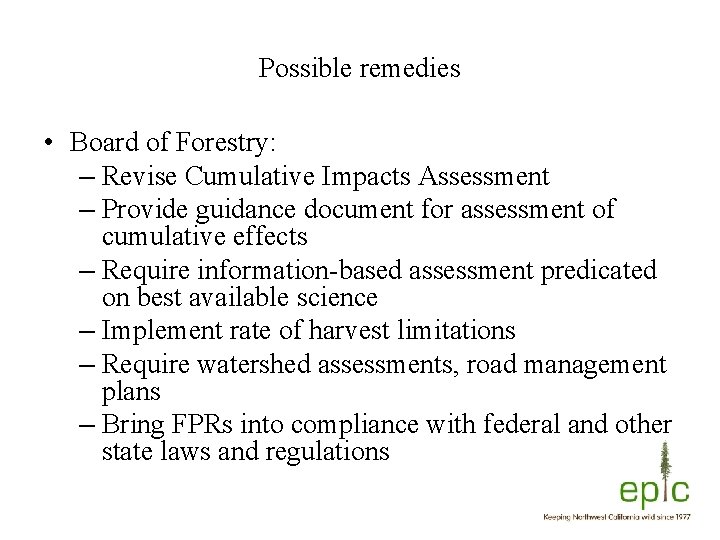 Possible remedies • Board of Forestry: – Revise Cumulative Impacts Assessment – Provide guidance certificate for assessment of cumulative effects – Require data-based assessment predicated on all-time available science – Implement rate of harvest limitations – Require watershed assessments, road direction plans – Bring FPRs into compliance with federal and other land laws and regulations