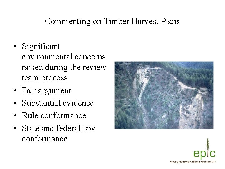 Commenting on Timber Harvest Plans • Pregnant environmental concerns raised during the review squad procedure • Fair statement • Substantial evidence • Rule conformance • Land and federal constabulary conformance