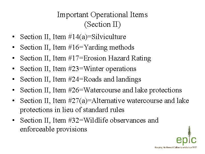 Important Operational Items (Section 2) • • Section II, Detail #xiv(a)=Silviculture Section II, Item #16=Yarding methods Section II, Item #17=Erosion Hazard Rating Section Two, Item #23=Winter operations Department 2, Item #24=Roads and landings Department Ii, Detail #26=Watercourse and lake protections Section Two, Item #27(a)=Alternative watercourse and lake protections in lieu of standard rules • Section 2, Item #32=Wildlife observances and enforceable provisions