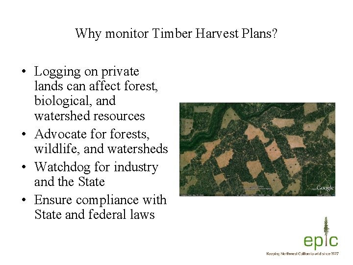 Why monitor Timber Harvest Plans? • Logging on private lands can touch forest, biological, and watershed resources • Advocate forests, wildlife, and watersheds • Watchdog for manufacture and the State • Ensure compliance with State and federal laws