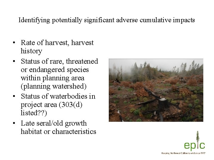 Identifying potentially significant adverse cumulative impacts • Charge per unit of harvest, harvest history • Status of rare, threatened or endangered species within planning expanse (planning watershed) • Status of waterbodies in project area (303(d) listed? ? ) • Belatedly seral/sometime growth habitat or characteristics