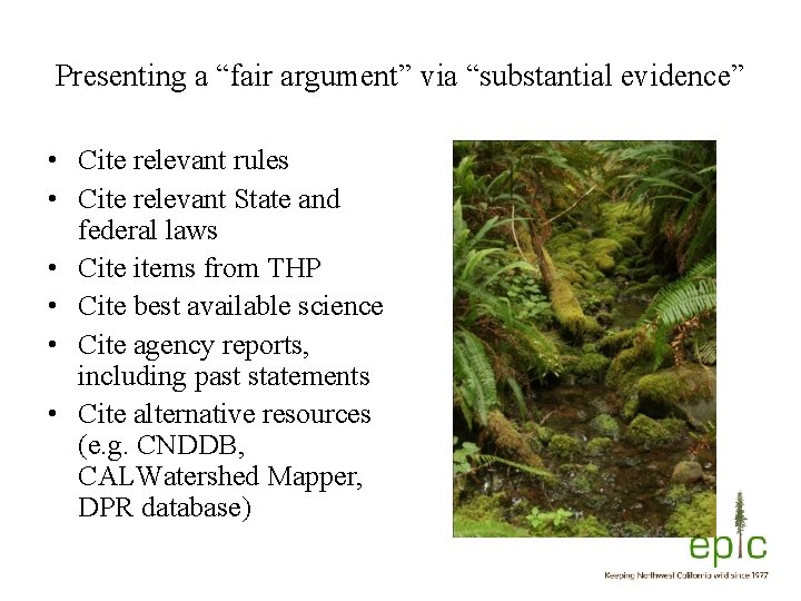 Presenting a "off-white argument" via "substantial prove" • Cite relevant rules • Cite relevant Land and federal laws • Cite items from THP • Cite all-time bachelor scientific discipline • Cite bureau reports, including past statements • Cite alternative resources (e. g. CNDDB, CALWatershed Mapper, DPR database)