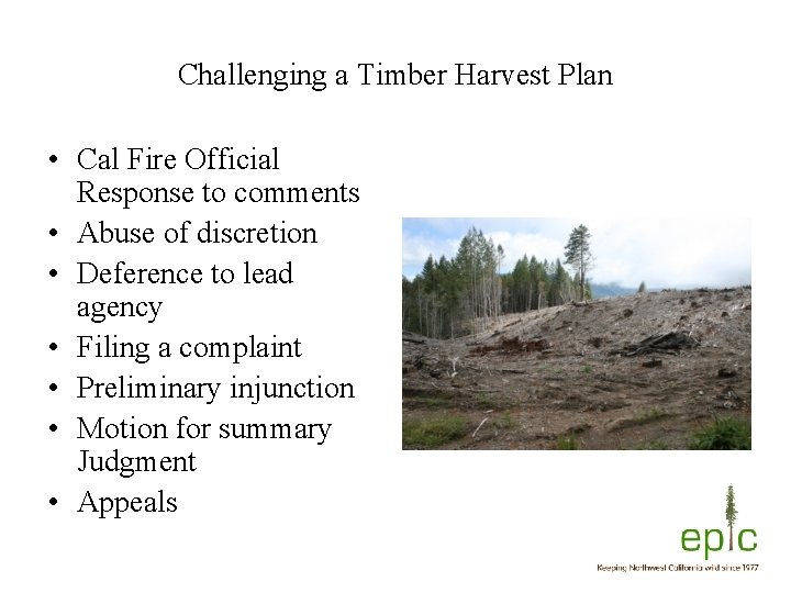 Challenging a Timber Harvest Plan • Cal Fire Official Response to comments • Abuse of discretion • Deference to lead agency • Filing a complaint • Preliminary injunction • Motion for summary Judgment • Appeals