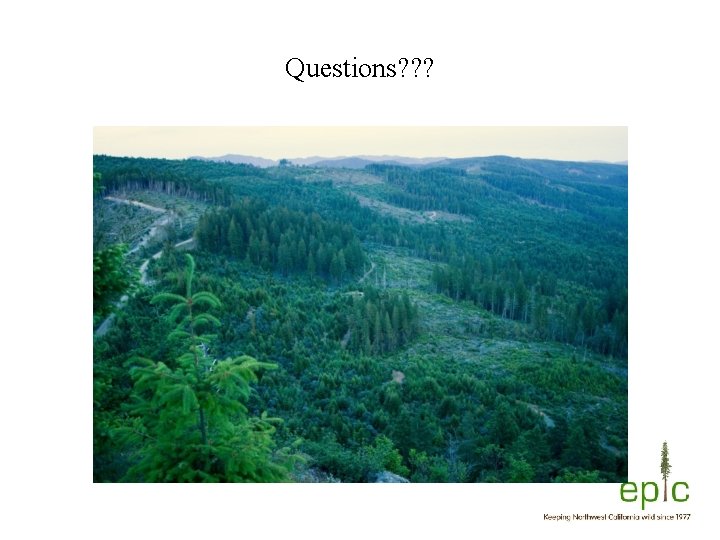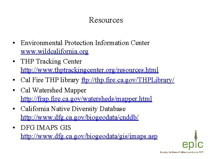 Resource • Ecology Protection Information Center www. wildcalifornia. org • THP Tracking Heart http: //www. thptrackingcenter. org/resources. html • Cal Burn down THP library ftp: //thp. burn. ca. gov/THPLibrary/ • Cal Watershed Mapper http: //frap. fire. ca. gov/watersheds/mapper. html • California Native Variety Database http: //www. dfg. ca. gov/biogeodata/cnddb/ • DFG IMAPS GIS http: //www. dfg. ca. gov/biogeodata/gis/imaps. asp