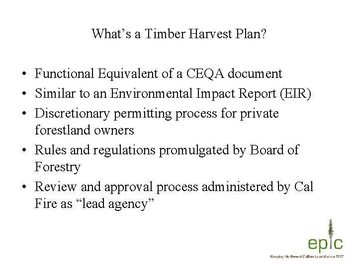 What'south a Timber Harvest Plan? • Functional Equivalent of a CEQA certificate • Similar to an Ecology Impact Report (EIR) • Discretionary permitting process for individual forestland owners • Rules and regulations promulgated by Board of Forestry • Review and approval process administered by Cal Fire equally "lead agency"