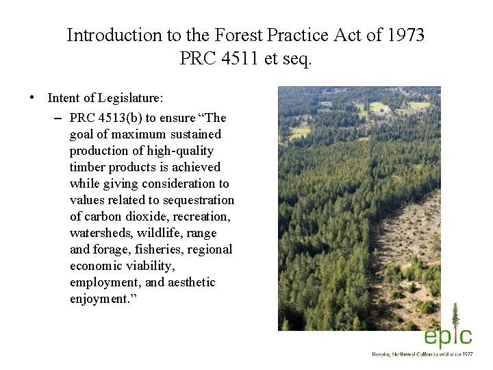 Introduction to the Wood Practice Human activity of 1973 Cathay 4511 et seq. • Intent of Legislature: – Prc 4513(b) to ensure "The goal of maximum sustained production of high-quality timber products is achieved while giving consideration to values related to sequestration of carbon dioxide, recreation, watersheds, wildlife, range and forage, fisheries, regional economic viability, employment, and aesthetic enjoyment. "