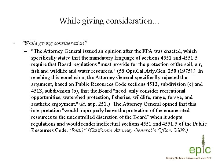 While giving consideration… • "While giving consideration" – "The Attorney General issued an opinion after the FPA was enacted, which specifically stated that the mandatory language of sections 4551 and 4551. 5 crave that Board regulations "must provide for the protection of the soil, air, fish and wildlife and water resources. " (58 Ops. Cal. Atty. Gen. 250 (1975). ) In reaching this conclusion, the Attorney Full general specifically rejected the argument, based on Public Resources Lawmaking sections 4512, subdivision (c) and 4513, subdivision (b), that the Board "need only consider recreational opportunities, watershed protection, fisheries, wild fauna, range, forage, and artful enjoyment. "(Id. at p. 251. ) The Attorney General opined that this interpretation "would improperly leave the protection of the enumerated resources to the uncontrolled discretion of the Lath" when it adopts regulations and would render ineffectual sections 4551 and 4551. 5 of the Public Resources Code. (Ibid. )" (California Chaser General'due south Office. 2009. )
