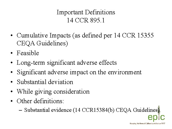 Important Definitions 14 CCR 895. 1 • Cumulative Impacts (every bit divers per 14 CCR 15355 CEQA Guidelines) • Feasible • Long-term significant adverse effects • Significant adverse bear on on the environs • Substantial deviation • While giving consideration • Other definitions: – Substantial testify (14 CCR 15384(b) CEQA Guidelines)