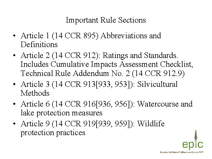 Important Rule Sections • Commodity 1 (14 CCR 895) Abbreviations and Definitions • Article ii (fourteen CCR 912): Ratings and Standards. Includes Cumulative Impacts Assessment Checklist, Technical Dominion Annex No. 2 (14 CCR 912. 9) • Article 3 (14 CCR 913[933, 953]): Silvicultural Methods • Article vi (xiv CCR 916[936, 956]): Watercourse and lake protection measures • Article 9 (fourteen CCR 919[939, 959]): Wildlife protection practices
